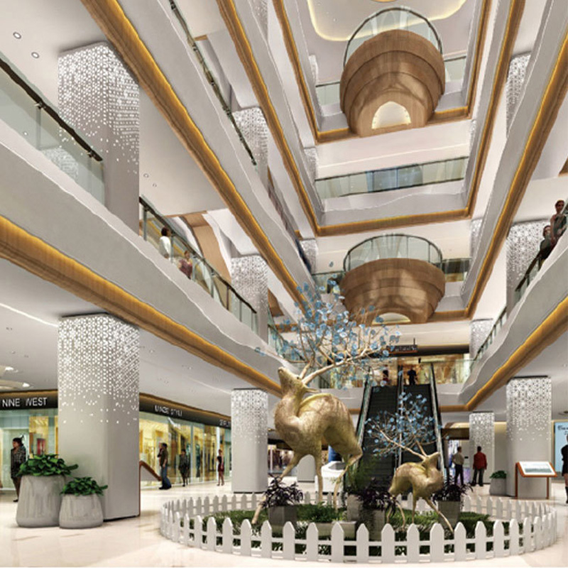 商业空间:购物中心中庭树状结构、品牌旗舰店符号化墙面;